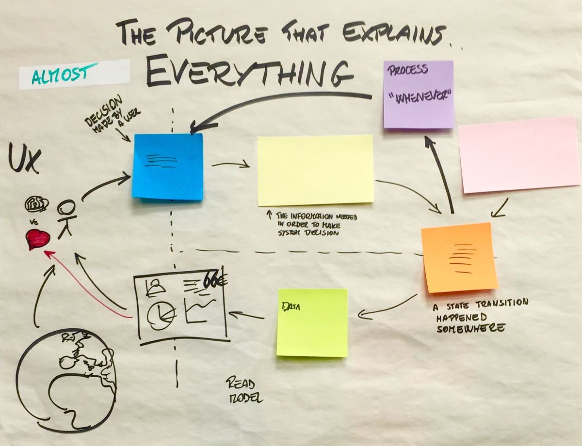Con una grande superficie a disposizione, possiamo modellare in maniera cooperativa. Ma perché questo avvenga è necessario trovare un linguaggio comune che permetta a tutti di partecipare alla conversazione. UML non è adatto a questo scopo, gli Eventi funzionano molto meglio.